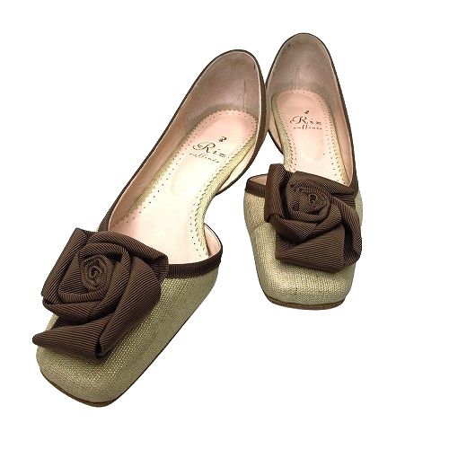リズラフィーネ Riz raffinee パンプス 靴 ローズモチーフ スクエアトゥ 箱有 23㎝ EE ベージュ ブラウン k38275 0415