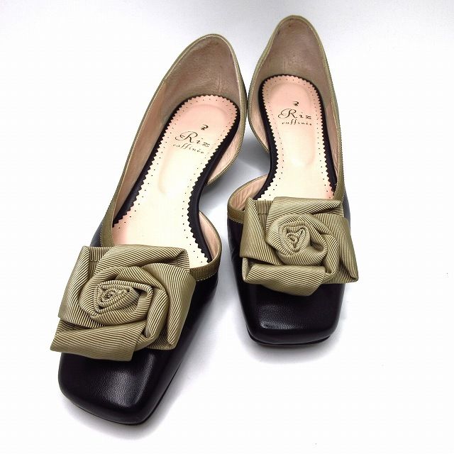 リズラフィーネ Riz raffinee パンプス 靴 スクエアトゥ バラモチーフ 箱有 23 1/2 EE ブラック ベージュ k38265 0415