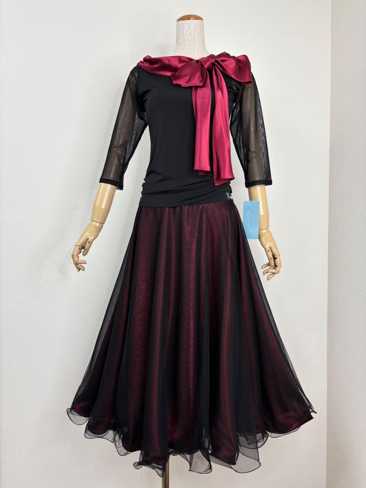 《新品》社交ダンス ブラック×ワイン ビッグリボンデザイン ボリュームフレアスカート セットアップドレス 衣装【Roger】
