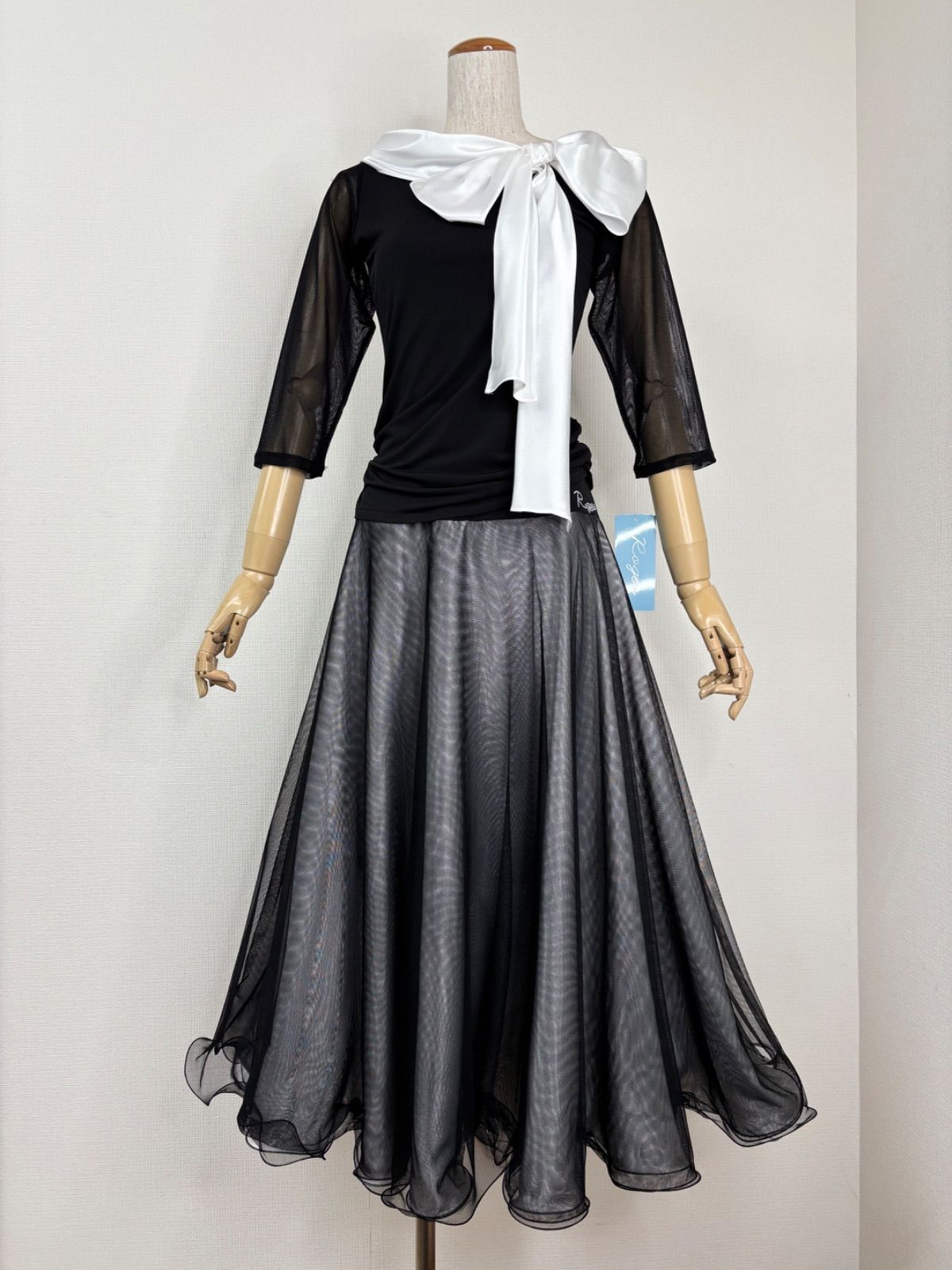 《新品》社交ダンス ブラック×ホワイト ビッグリボンデザイン ボリュームフレアスカート セットアップドレス 衣装【Roger】