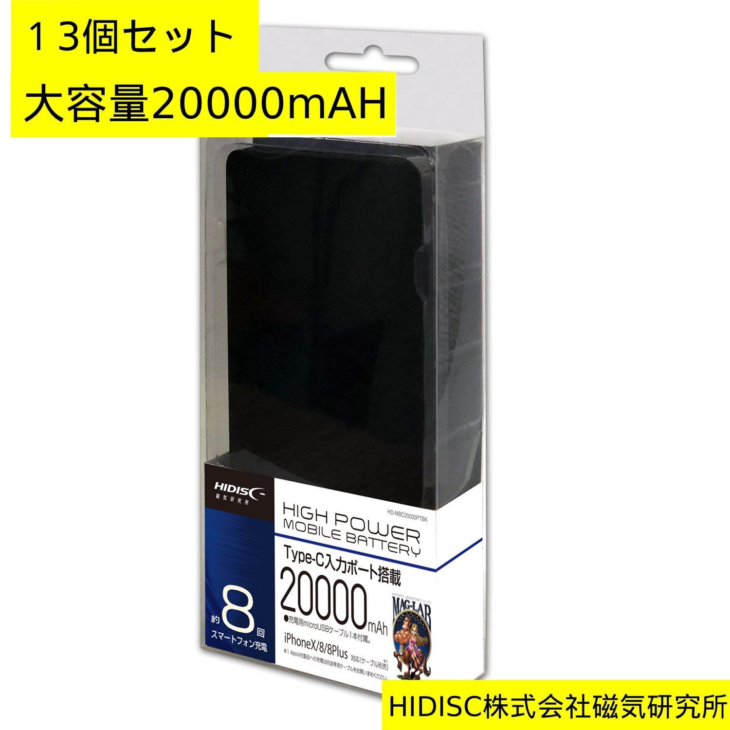 【13個セット】HIDISC 大容量20000mAH モバイルバッテリー 2ポート出力5V2.4A 2台同時充電可能 スマートフォン約8回フル充電 HD-MBC20000PTBK PSEマーク付 過充電・過放電保護機能や短絡保護機能搭載 管YN270AZ