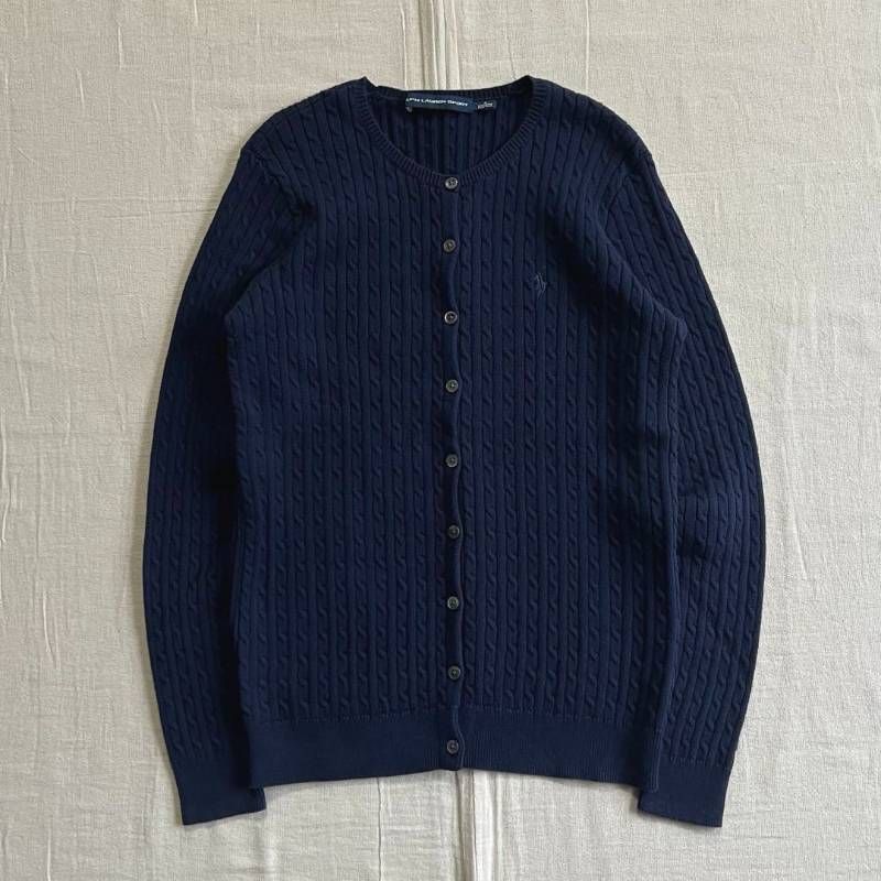 希少 00s POLO RALPH LAUREN SPORT ラルフローレンスポーツ ケーブル編みコットンニット ロングスリーブ 丸首カーディガン ネイビー ワンポイントポニーロゴ刺繍 M アメカジ Y2K cable cotton knit cardigan