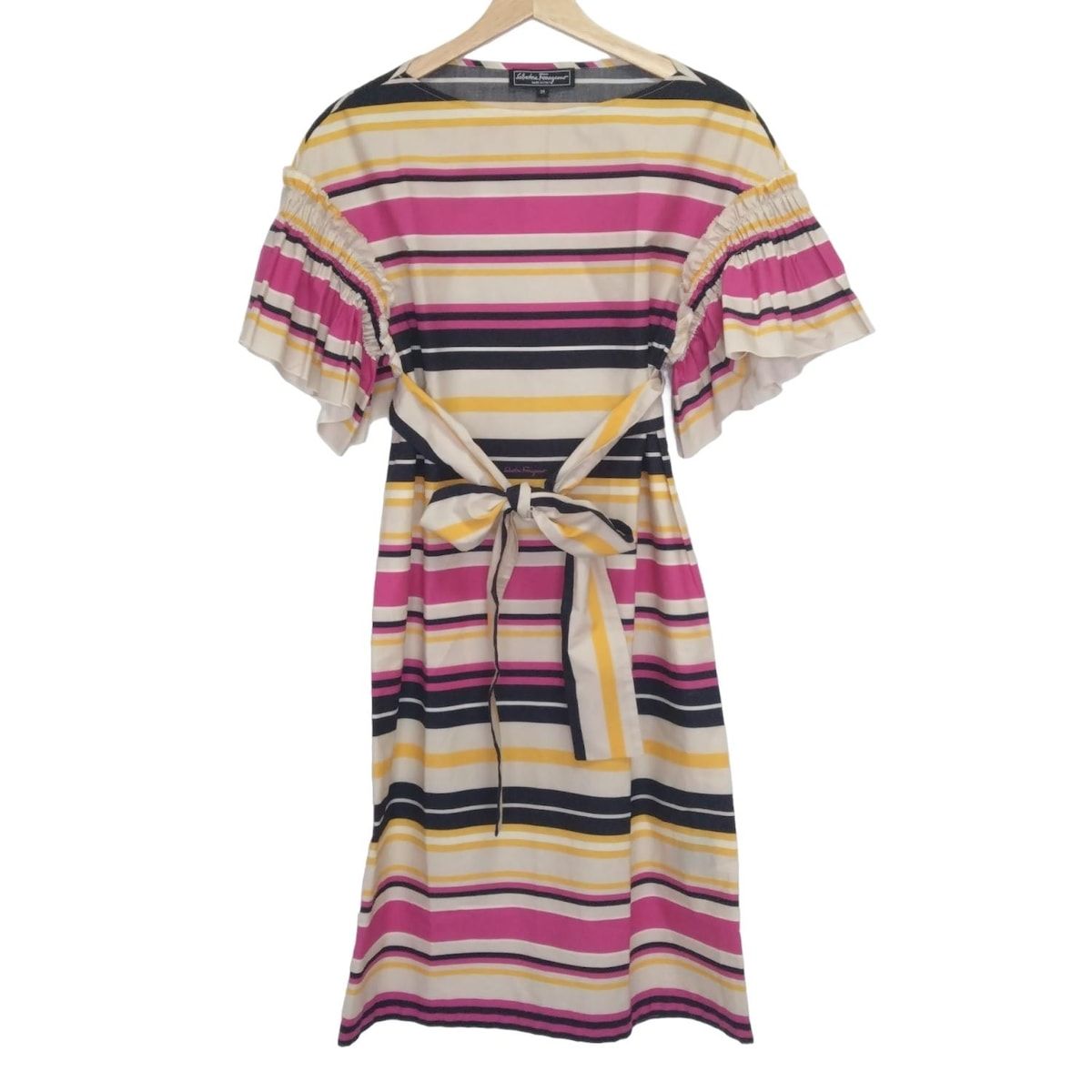 サルバトーレフェラガモ ワンピース サイズ38 S レディース - ベージュ×ピンク×マルチ クルーネック/半袖/ひざ丈/ボーダー