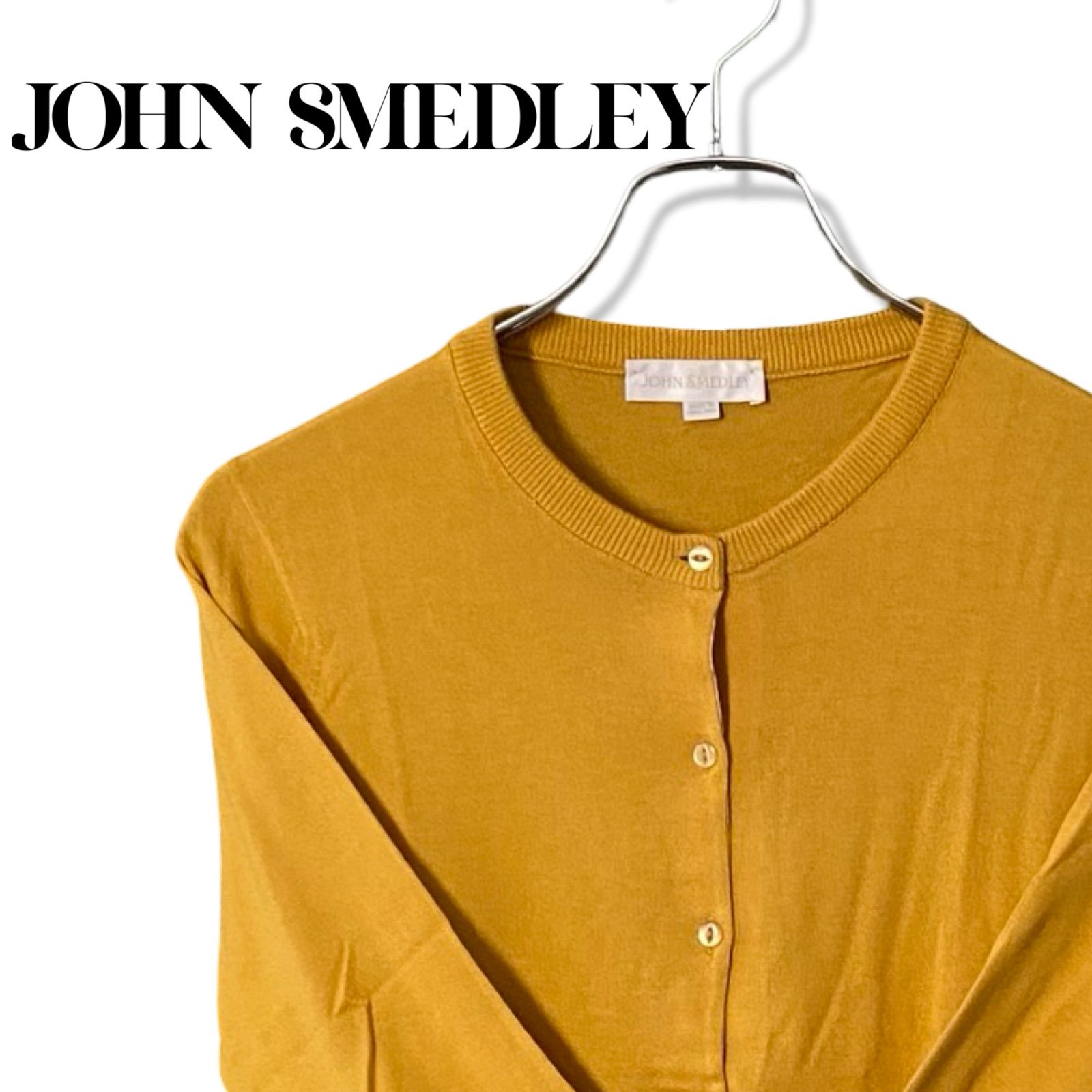 JOHN SMEDLEY ジョンスメドレー シーアイランドコットン カーディガン レディース マスタード からし色 イギリス製 綿100% 七分袖 クルーネック 上質素材 Sサイズ相当 エレガント 156TY