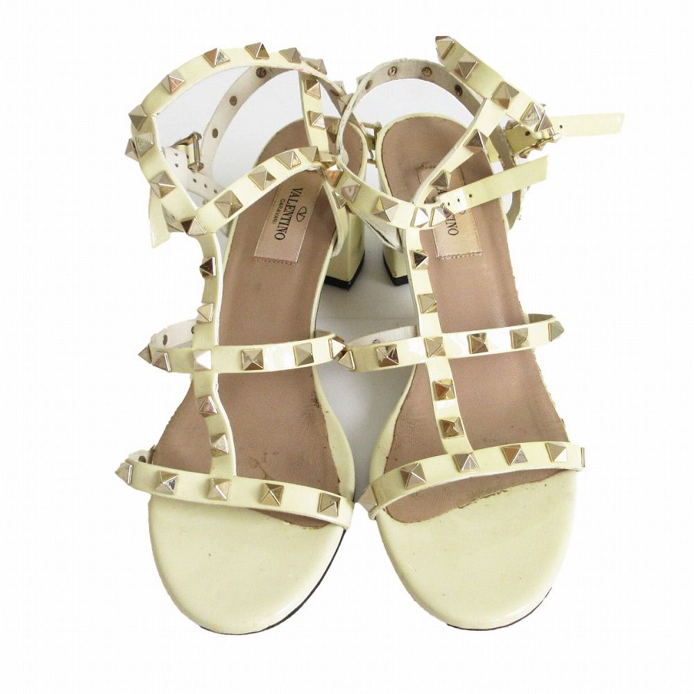 Valentino Garavani ヴァレンティノ・ガラヴァーニ サンダル ロックスタッズ パテントレザー チャンキーヒールソール アンクルストラップ クリーム 38.5 24.5cm レディース 【中古】
