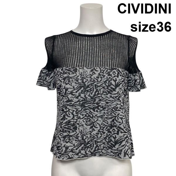◇ チヴィディーニ CIVIDINI 半袖ニット カットソー シースルー 幾何学模様 クルーネック 異素材 黒 白 綿混 36 S 7号 レディース S6D389