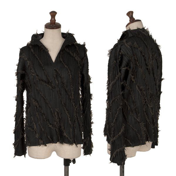 プリーツプリーズPLEATS PLEASE フリンジラインデザインVネックカットソー 黒茶3