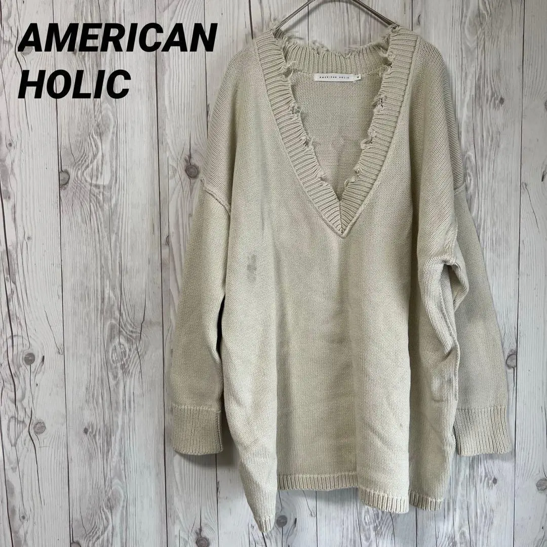【アメリカンホリック】長袖ニット ダメージ Vネック M 白 カジュアル