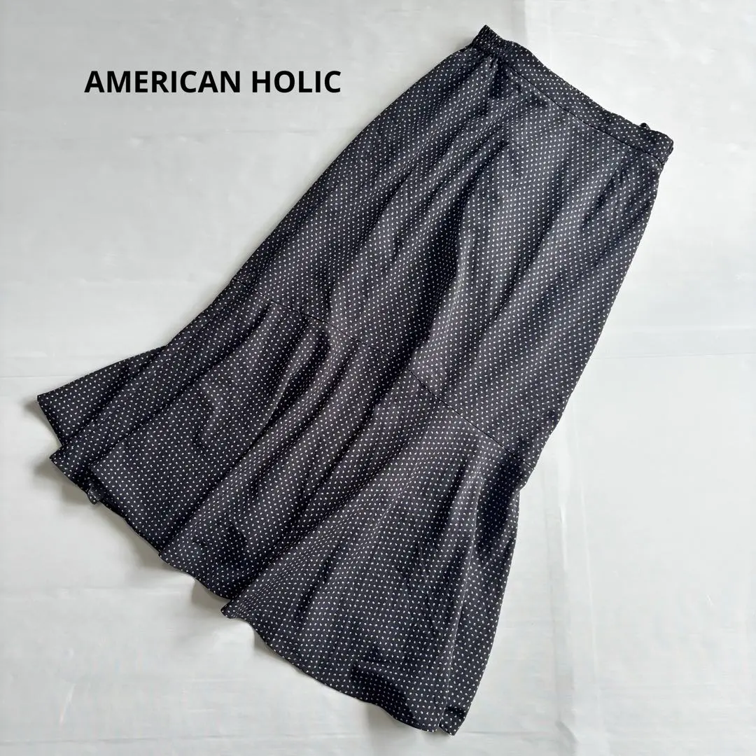 【アメリカンホリック】ロングフレアスカート ドット柄 裏地付き 黒 ブラック/L