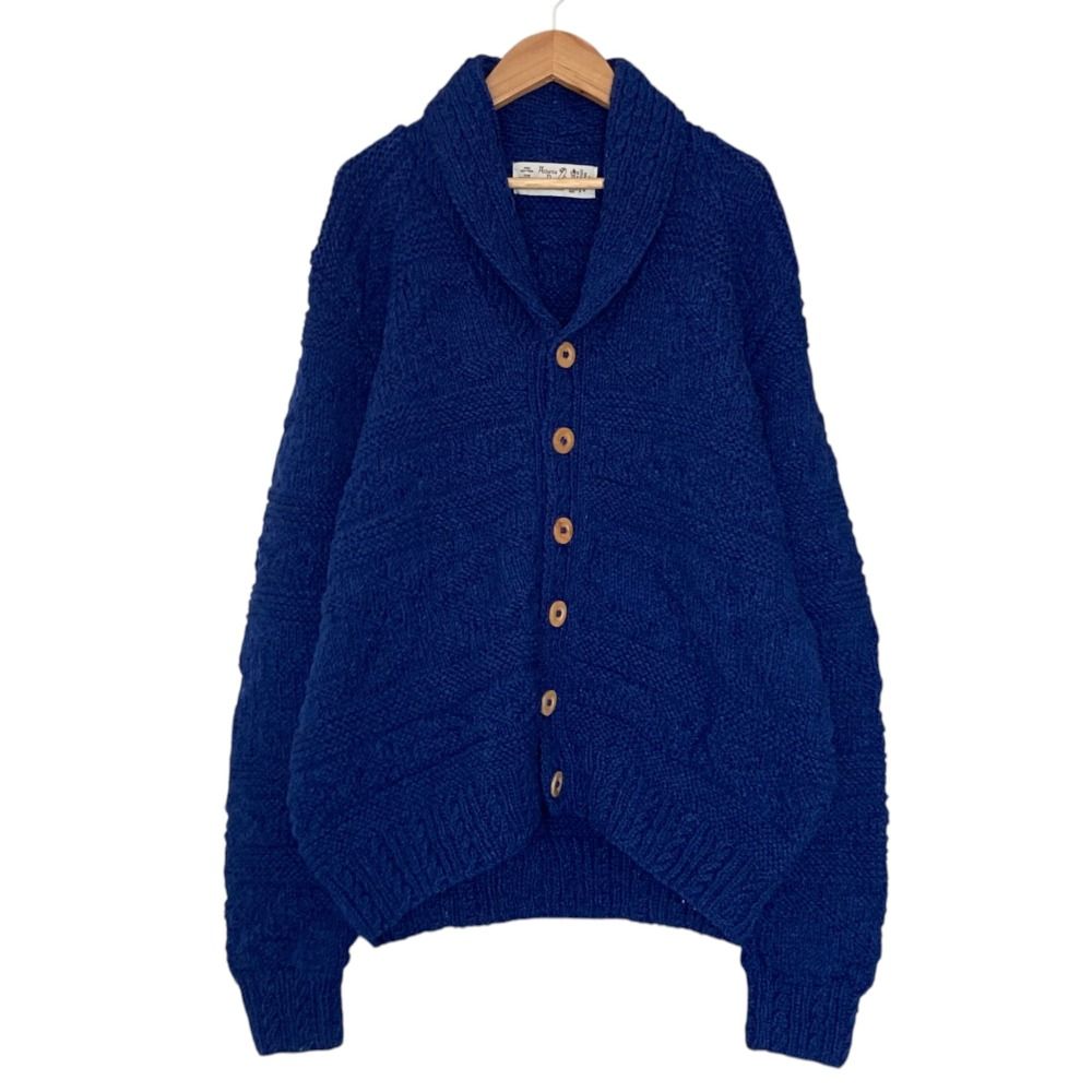 美品 Athena Designs アテナデザイン ショールカラー ハンドニット カーディガン ブルー メンズ レディース 古着 中古 USED