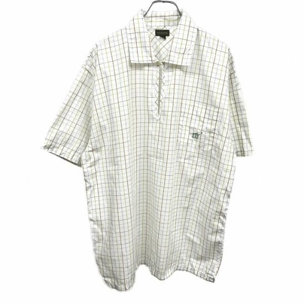 古着 ヘンリーコットンズ プルオーバーシャツ チェック ティアドロッププラケット 開襟 半袖 釣り人の刺繍 綿100% M 白×緑×茶×白 メンズ