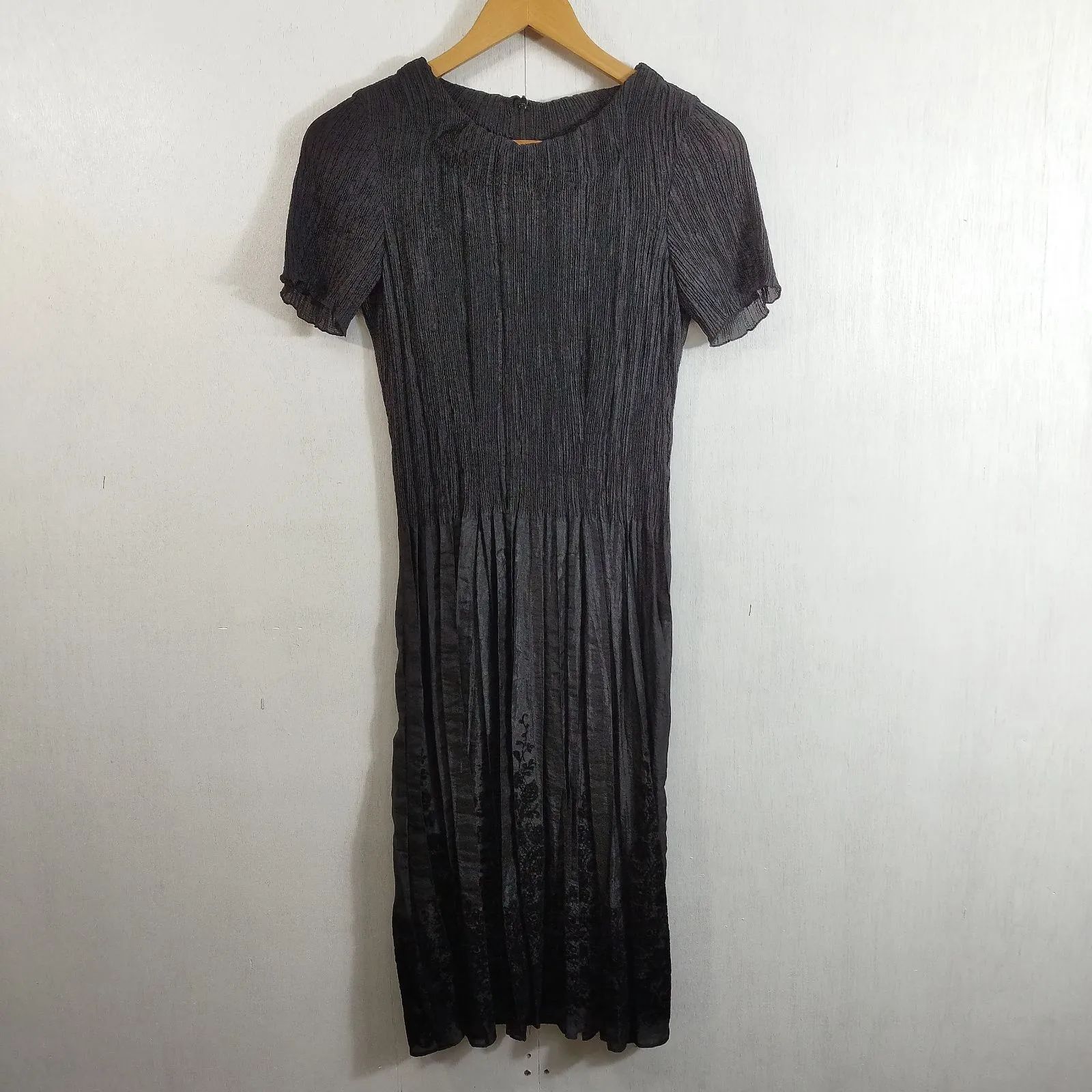 HIROKO BIS ヒロコビス 半袖 プリーツ ワンピース 裾 レース柄 フロッキー プリント ブラック 9 HIROKO KOSHINO ヒロココシノ ブラック 9 D326