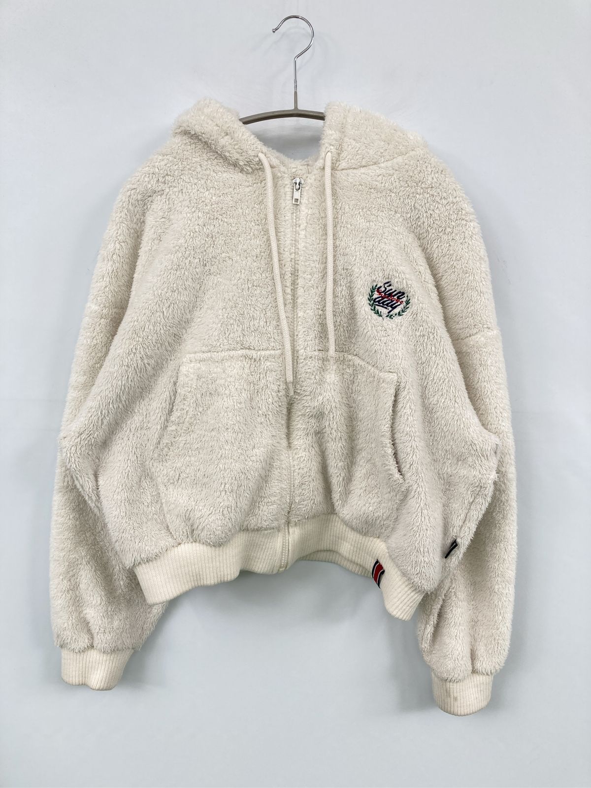 ROMANTIC CROWN ブルゾン S アイボリー ボア 無地 バックプリント ワンポイント ブランドロゴ 刺繍 ショート丈 フードあり ジップアップ