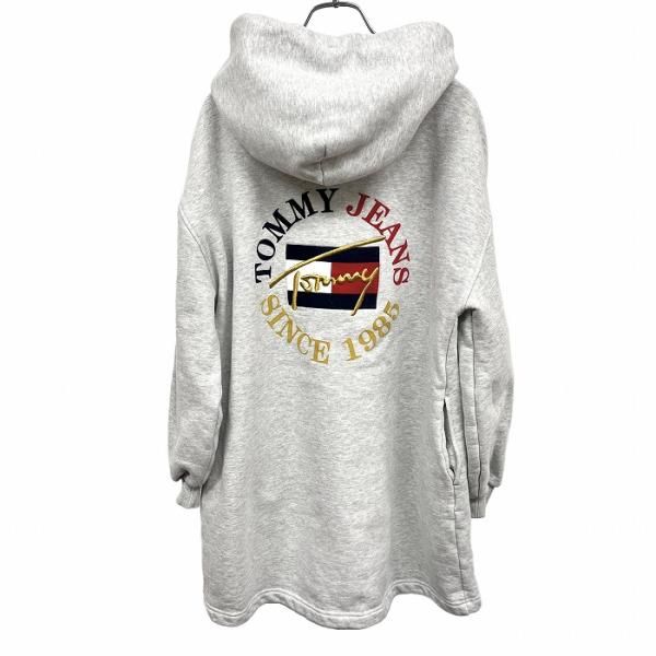 古着 TOMMY JEANS パーカーワンピース スウェット 裏起毛 プルオーバー 長袖 綿100% M 杢グレー 杢グレー×紺×赤×白×ゴールド レディース