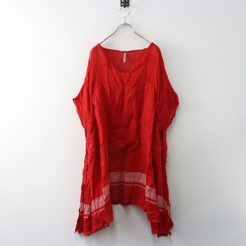 ヴェリテクール veritecoeur 染色 リネン サイドギャザー ラウンドヘム チュニック ワンピース F レッド┃赤 ワイド【2400014908237】