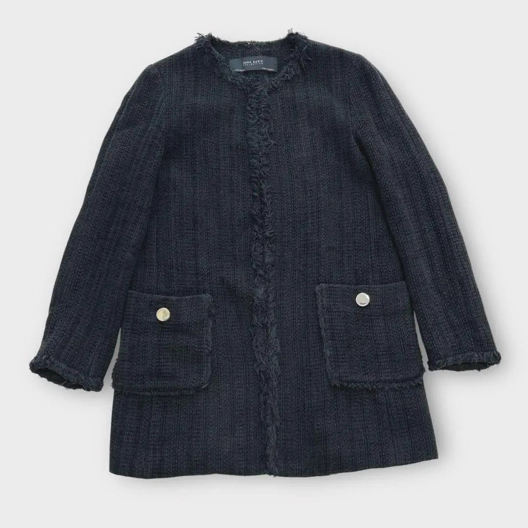 ザラ ベーシック ノーカラージャケット ツイード S ネイビー系