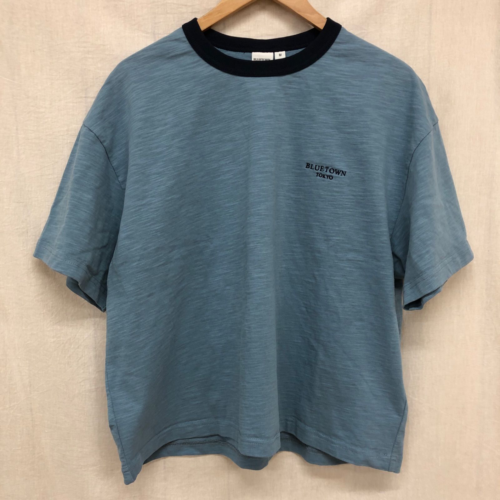 訳あり美品 BONBON BLUETOWN バンブーコットンリンガーTシャツ 刺繍ロゴ ブルー M
