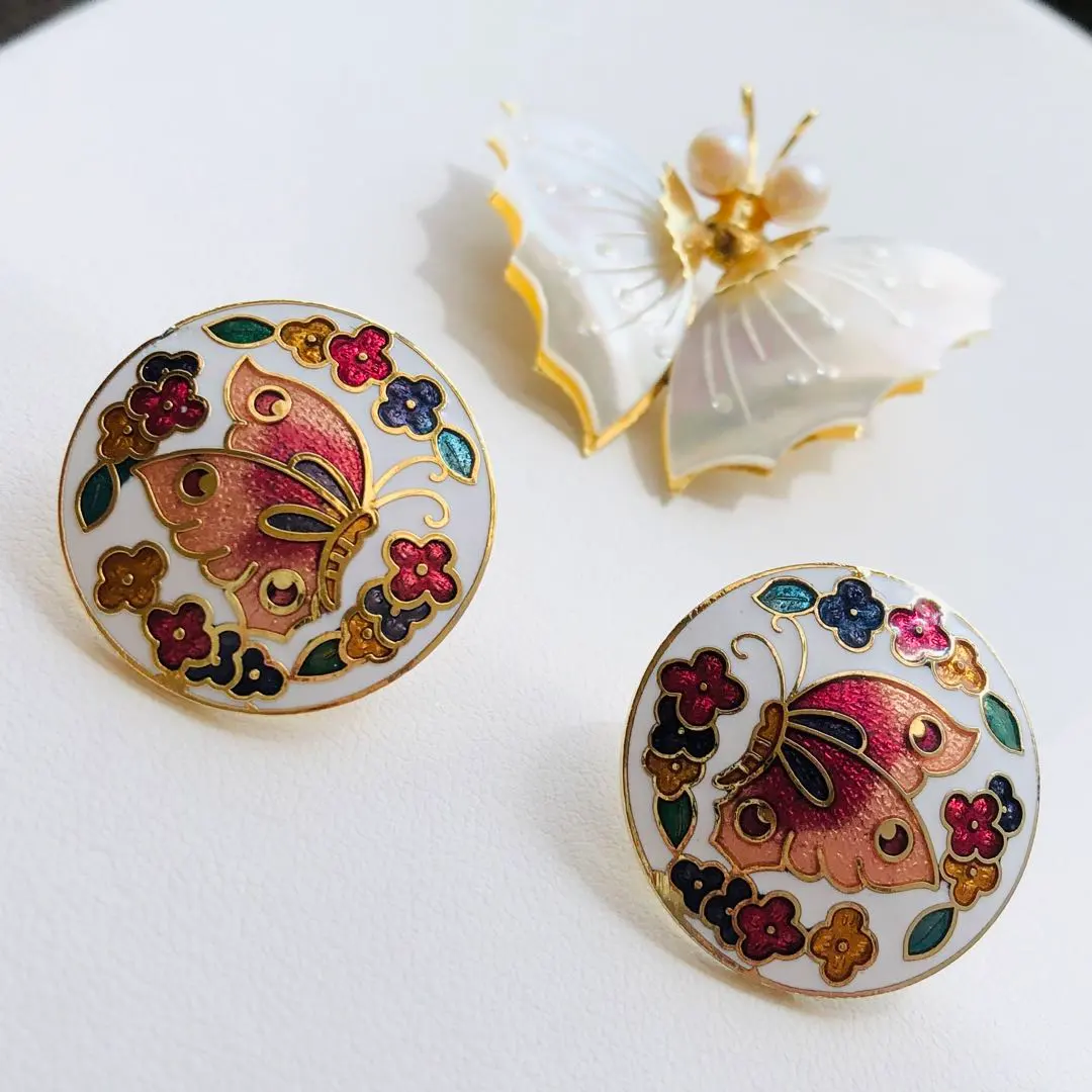 蝶と花 七宝焼き エナメルイヤリング & 天然 真珠 ブローチ セット