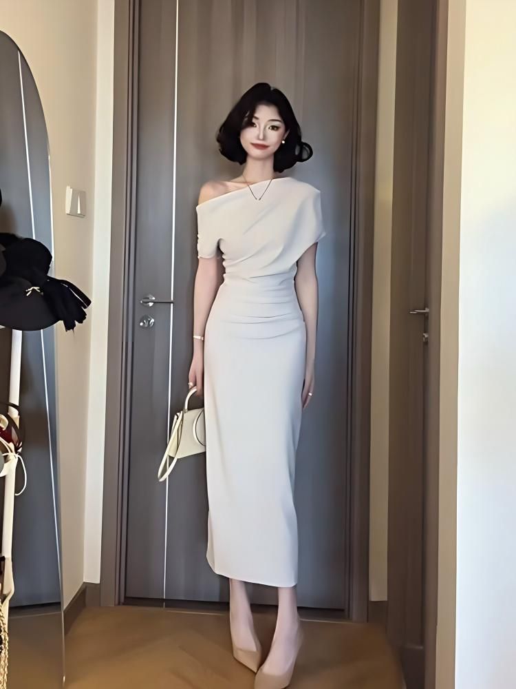 送料無料 ドレス ワンピース レディース 2026 夏 オフショルダー ドレープ ギャザー ウエスト 絞り ノースリーブ ロング / ショート 選択可 S M L XL XXL かわいい 上品