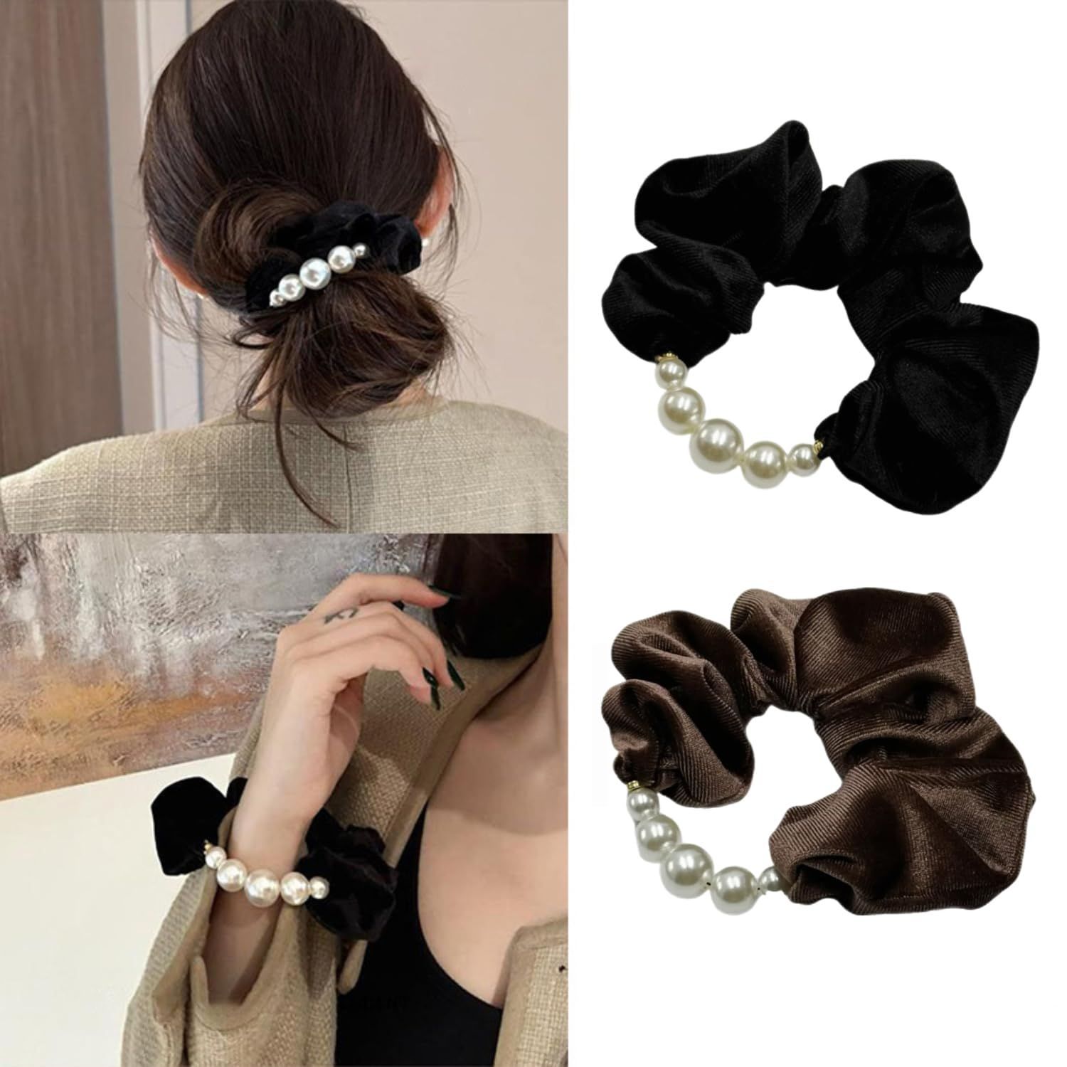 コーヒー ブラック 入園式 入学式 卒業式 2次会 結婚式 レディース 韓国風 大人 秋冬 シンプル 上品 ヘアアクセサリー 2枚セット パール ベロア シュシュ ヘアゴム