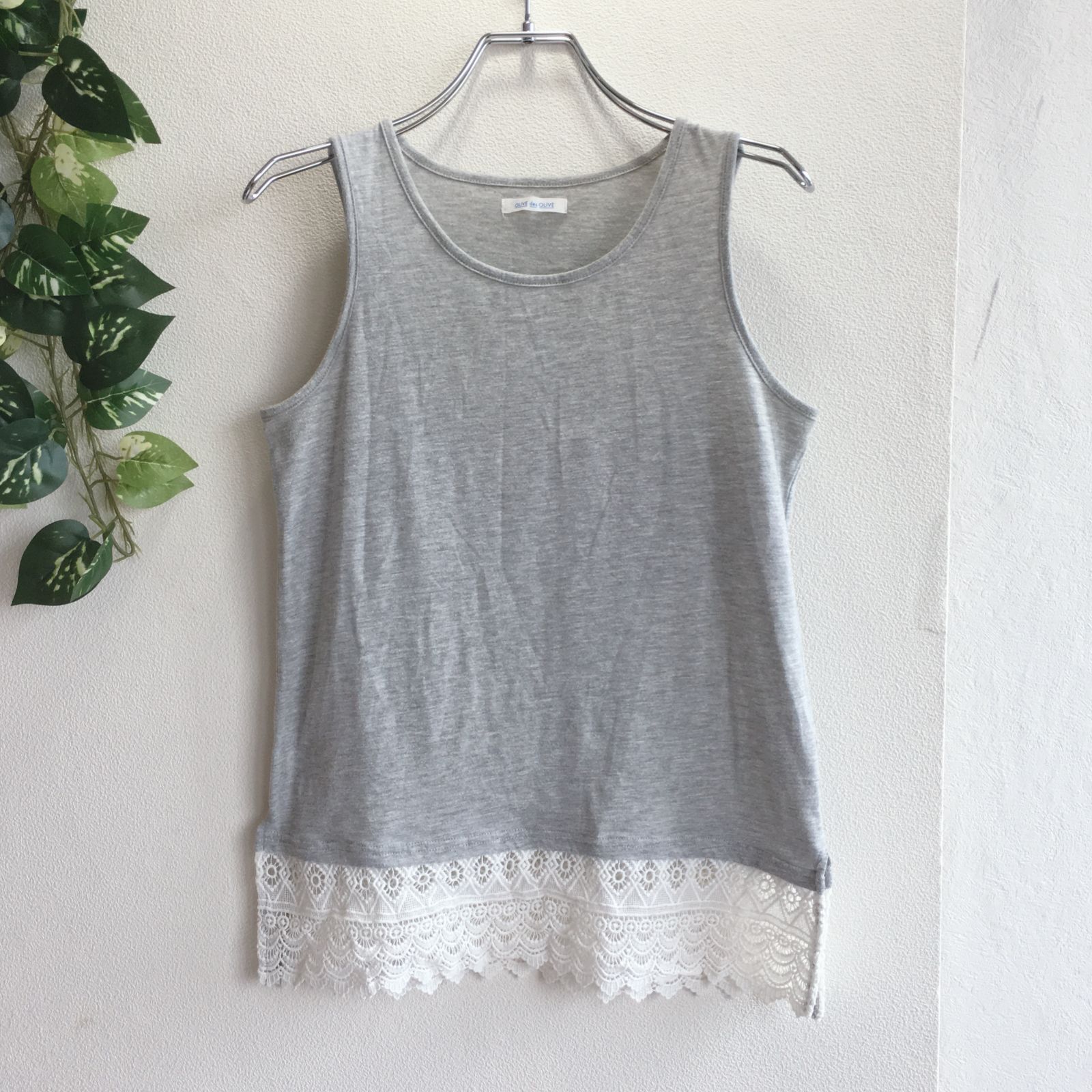美品✨ オリーブデオリーブ OLIVE des OLIVE タンクトップ Tシャツ カットソー ノースリーブ 裾レース 切替 レイヤード グレー 灰色 丸首 クルーネック ナチュラル 薄手