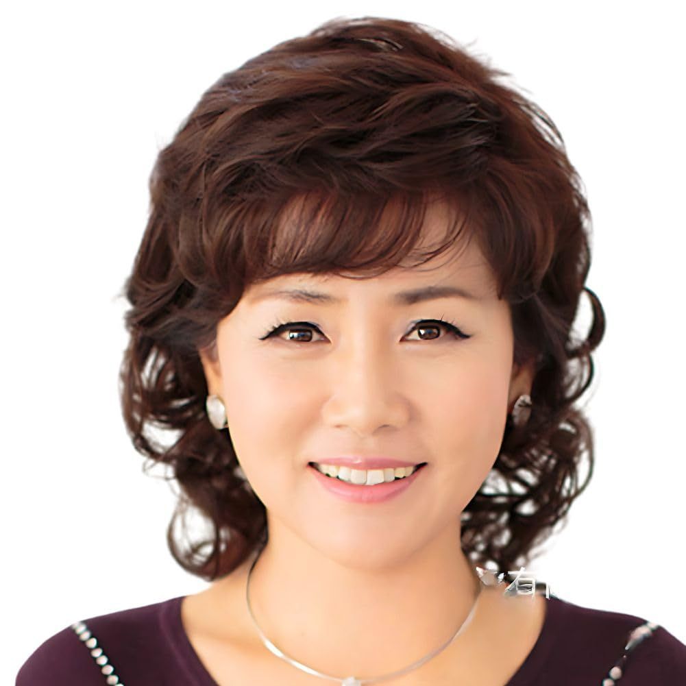 軽量 斜め前髪 ボブ 快適 ふんわり パーマ 自然 おしゃれ かつら ショートヘア (ブラウン(大きめサイズ)) レディース 中高年フルウィッグ