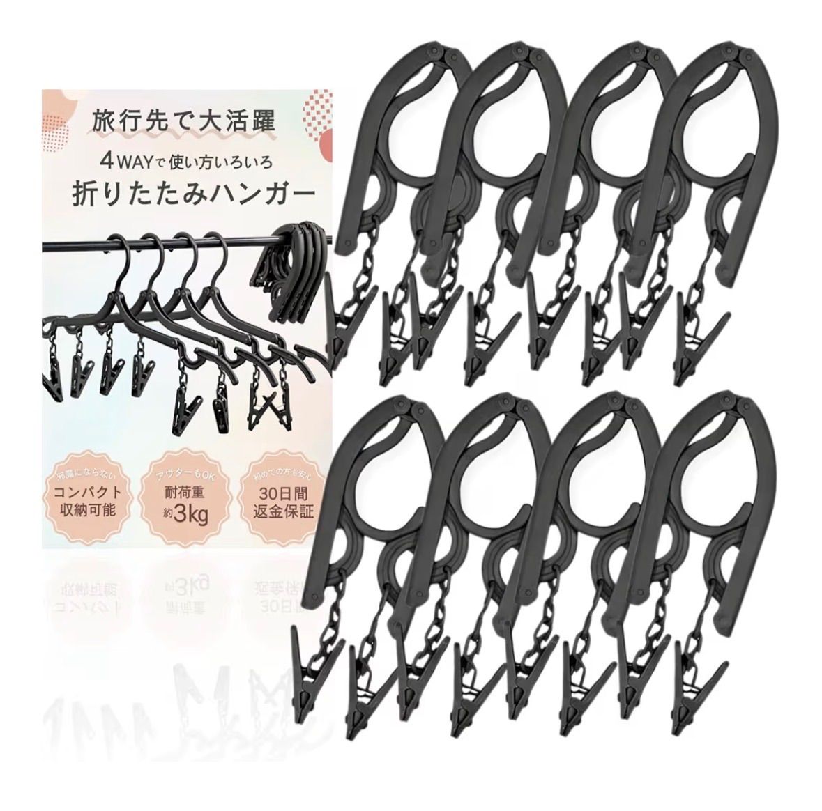 【旅行の新定番!コンパクトな4way折りたたみハンガー】 携帯ハンガー 8個セット ブラック 黒 折り畳み 洗濯ばさみ付き ピンチハンガートラベル用品 洗濯物干し 旅行用 海外旅行 入院 便利グッズ