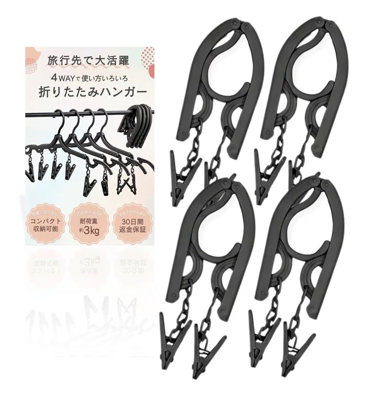 【旅行の新定番!コンパクトな4way折りたたみハンガー】 携帯ハンガー 4個セット ブラック 黒 折り畳み 洗濯ばさみ付き ピンチハンガートラベル用品 洗濯物干し 旅行用 海外旅行 入院 便利グッズ