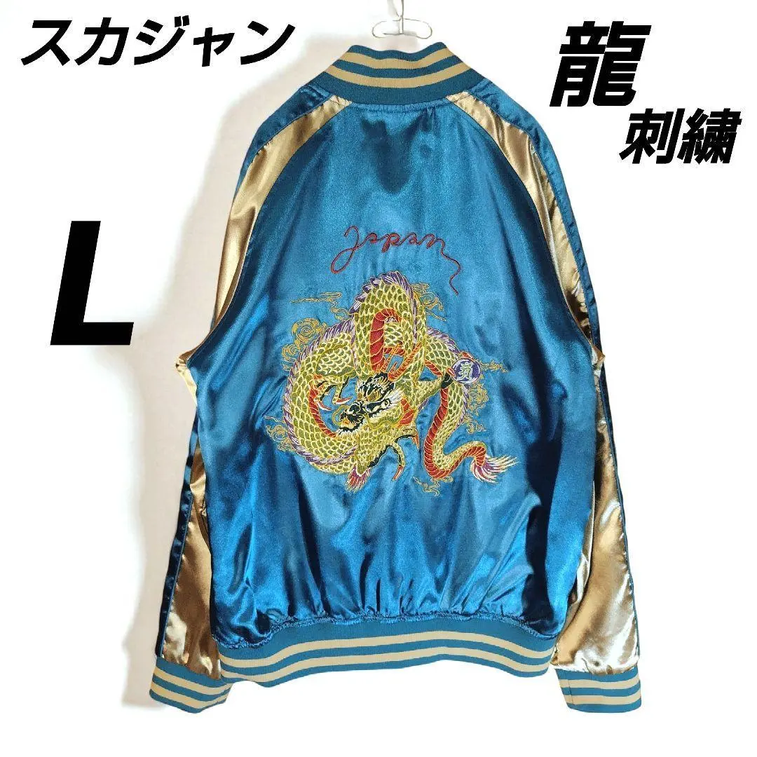 スカジャン 龍 刺繍 Lサイズ ブルー ゴールド 一心如鏡 ポケット3個