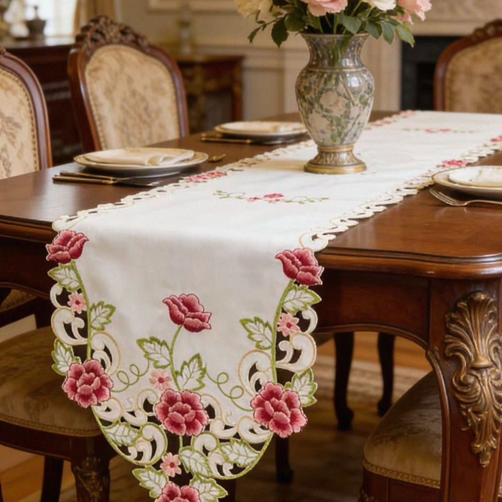テーブルランナー 40X175Xcm 薔薇刺繍 タッセル付き