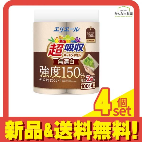 エリエール 超吸収キッチンタオル 無漂白 100カット 4ロール入 4個セット まとめ売り