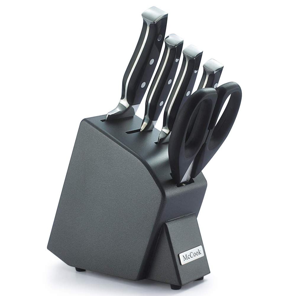 McCook 6点包丁セット- ステンレス鋼製包丁立て付きで、多機能な三徳包丁、牛刀包丁、パン切り、ペティナイフ、料理バサミ、シェフナイフ、菜切り包丁が揃う家庭用の肉切り、調理に最適な一体構造ハンドルの包丁セット"/