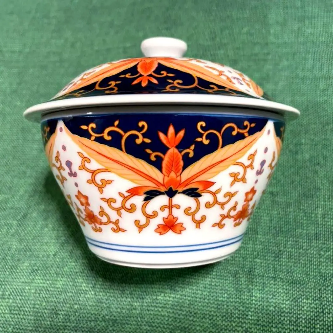 有田焼 蓋付き煮物椀 青とオレンジの花柄