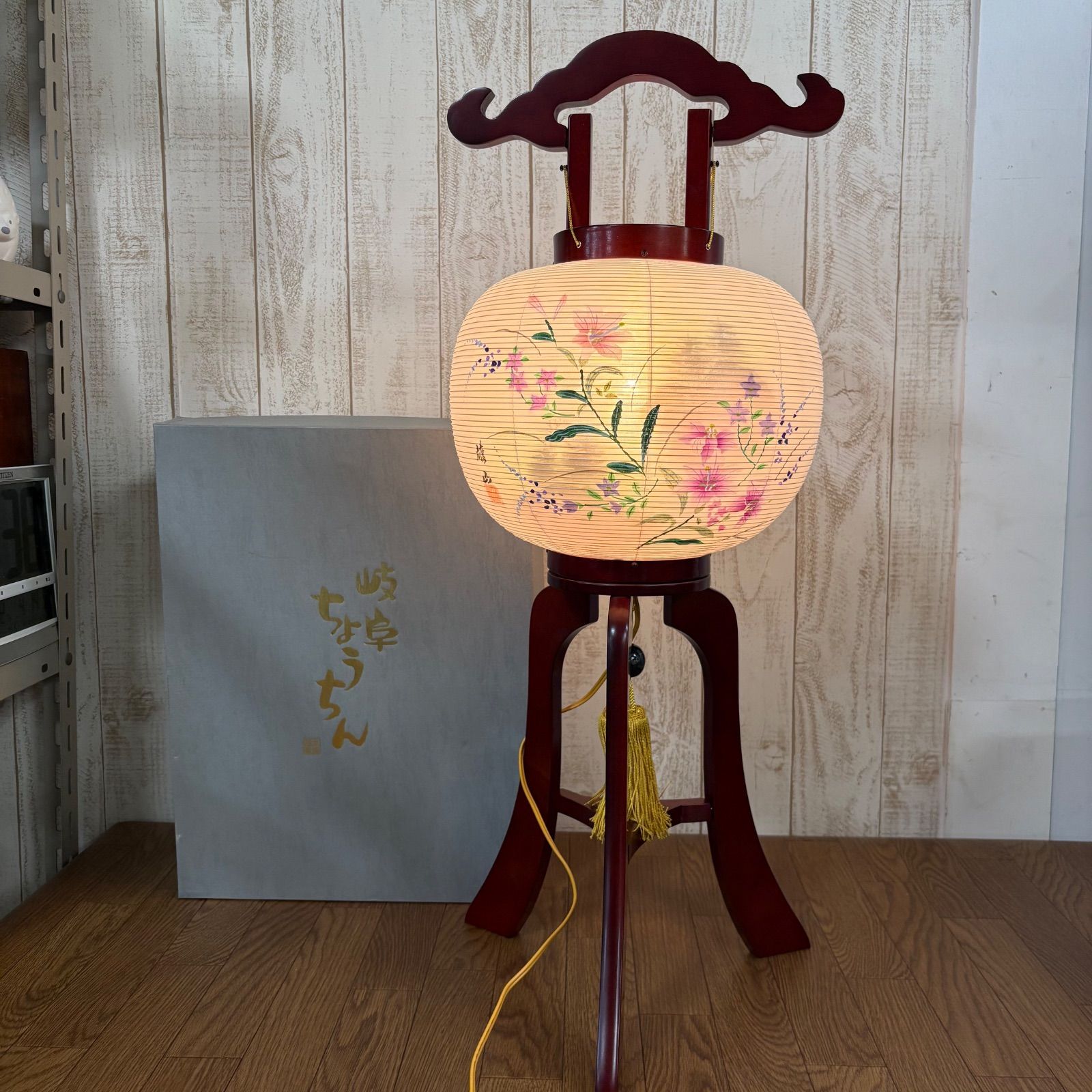 C-4 昭和レトロ 木製 本場岐阜 提灯 大内行灯 盆提灯 花柄 絹張 電装式