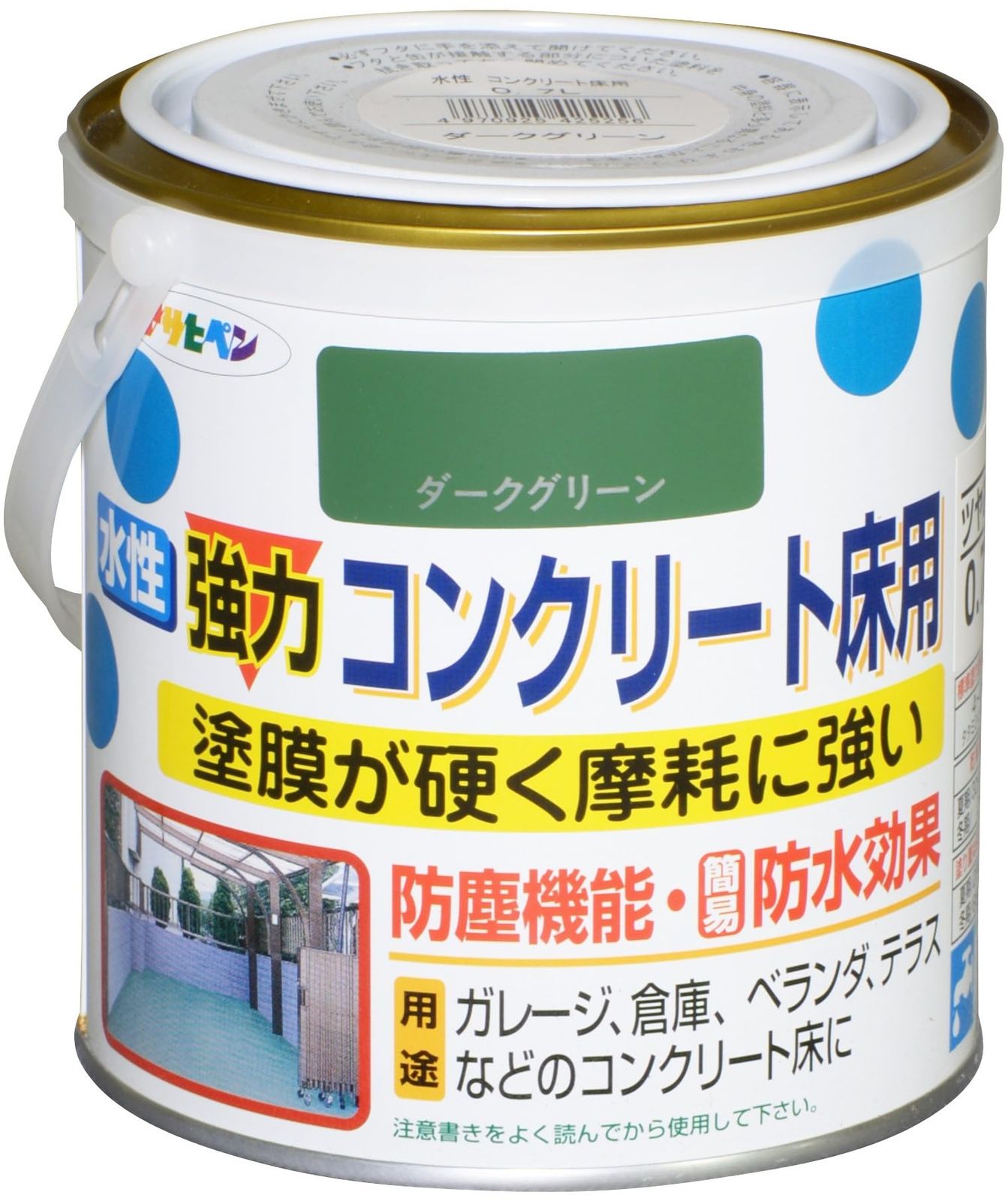 新品 アサヒペン 水性強力コンクリート床用 1.6L ダークグリーン 塗料 ペンキ 1回塗り 高光沢 硬い塗膜 摩耗に強い 防塵 防水 耐ガソリン性 ベランダ ガレージ 日本製