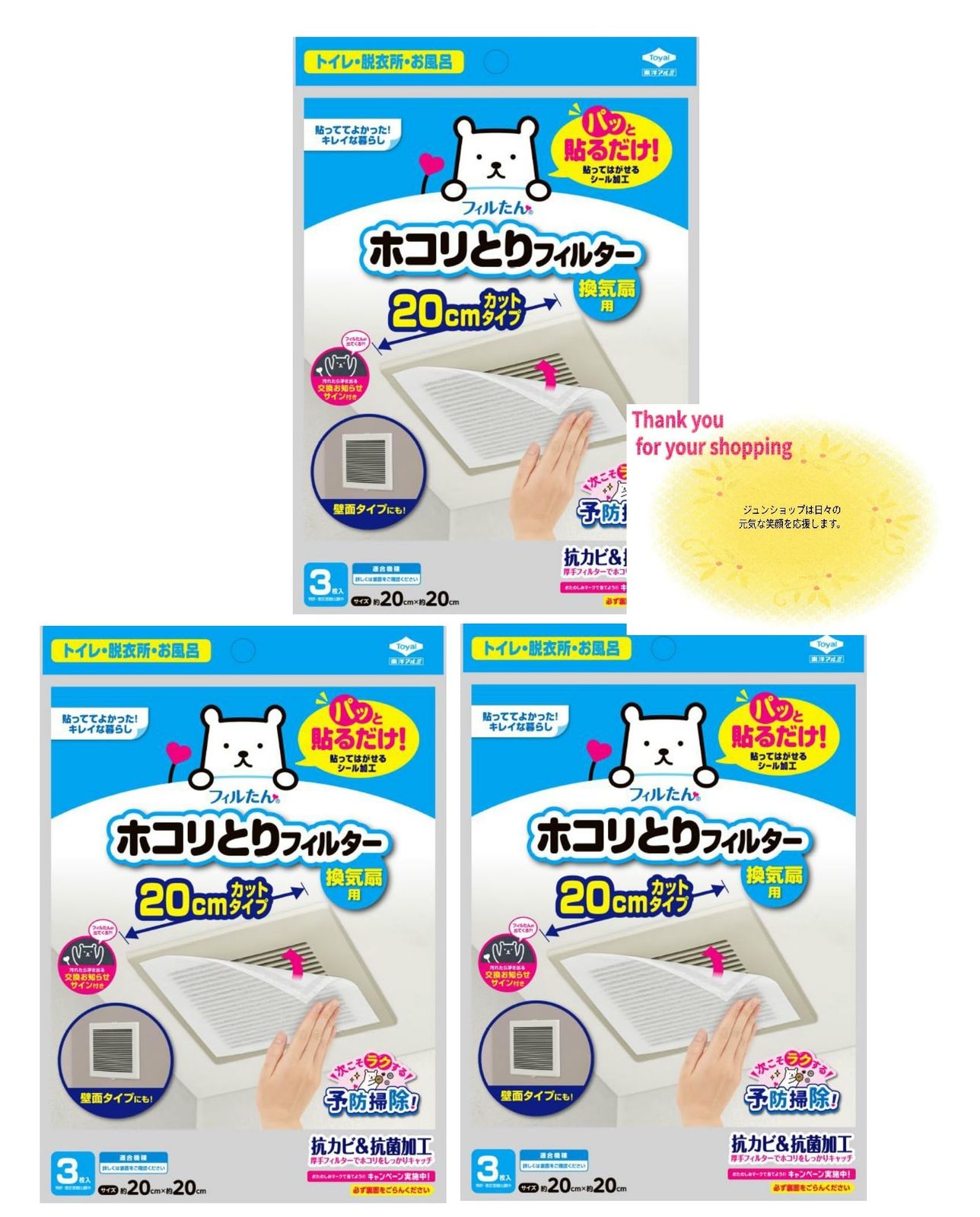 [まとめ売り]3袋 東洋アルミ パッと貼るだけ ホコリとりフィルター 換気扇用 20cm 3枚入 × 3セット 計9枚 抗菌 抗カビ オリジナルカードつき