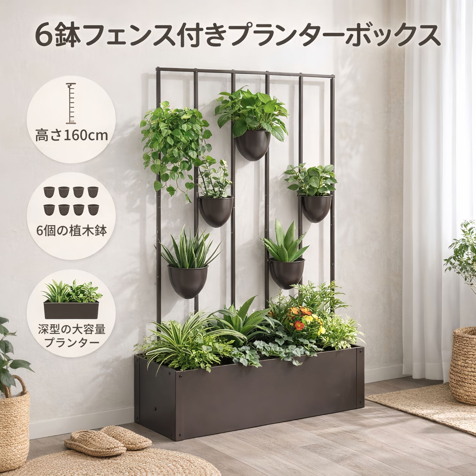 【4/30まで限定★1000円OFFクーポン】フェンス付きプランター 花台 目隠し ガーデンラック 6鉢付き 大容量 深型プランターボックス 電着塗装 防錆 ベランダ 庭 玄関 おしゃれ 簡単設置 92×36×160cm ブラウン