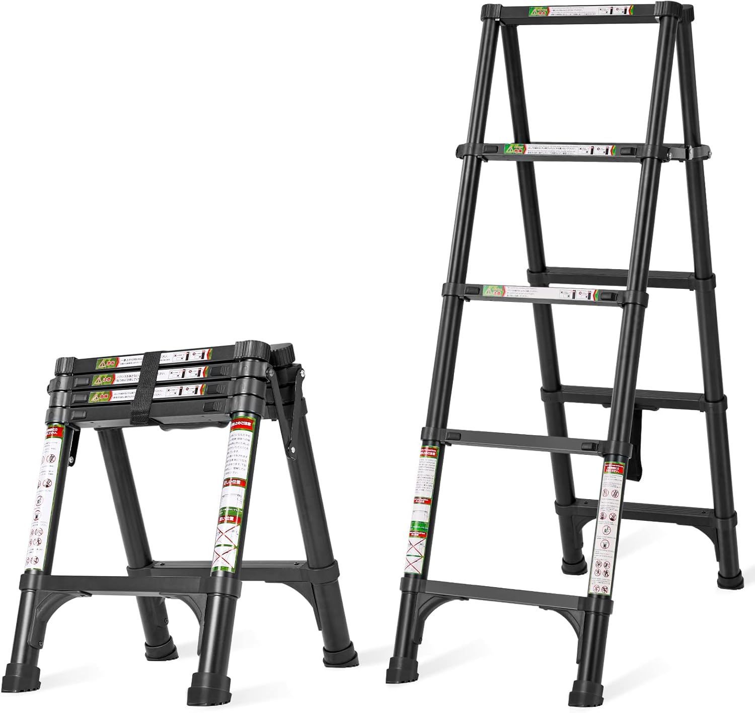 (040910ブラック, 1.4+1.4m)伸縮脚立はしご 踏み台 軽量伸縮自在 折りたたみ 持ち運び便利 室内屋外両用 アルミはしご 自動・安全ロック付き 耐荷重150 kg