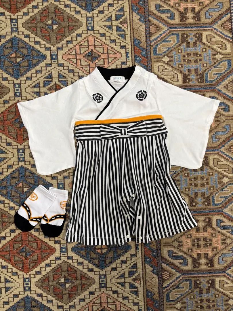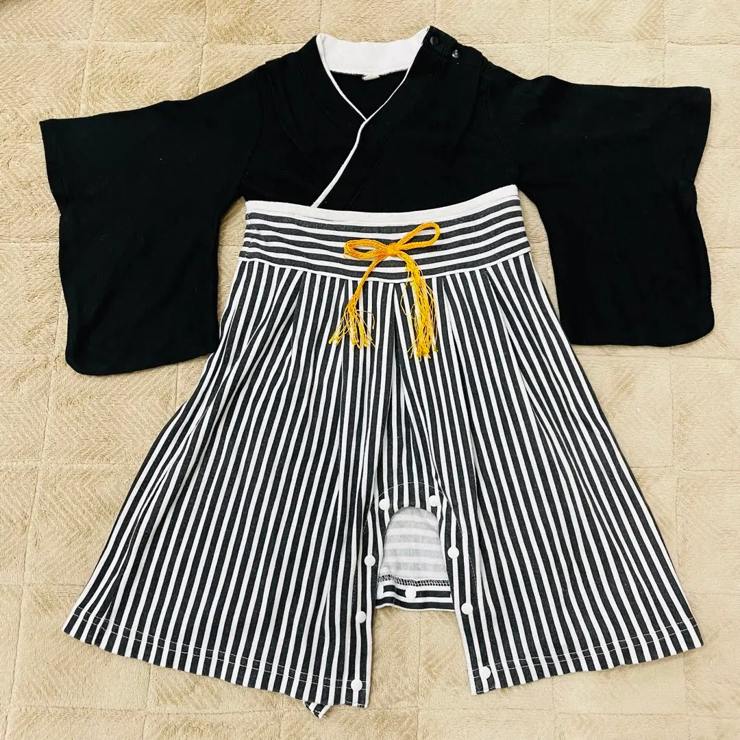 ベビー 着物風服、黒白ストライプ、袴、ロンパース、和服