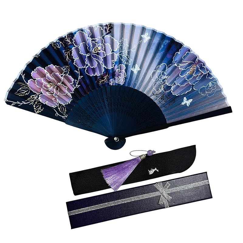 [&JuJu] 扇子 レディース 【季節の花々 桜 桔梗 牡丹 蓮 】 扇子入れ 箱入り (藍色牡丹)