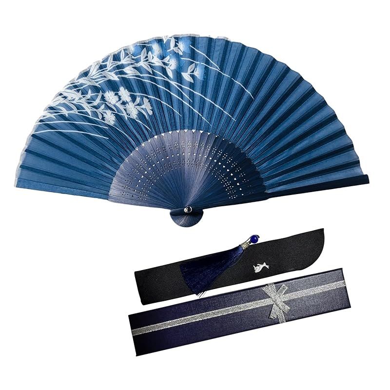 [&JuJu] 扇子 レディース 【季節の花々 桜 桔梗 牡丹 蓮 】 扇子入れ 箱入り (藍色桔梗撫子)