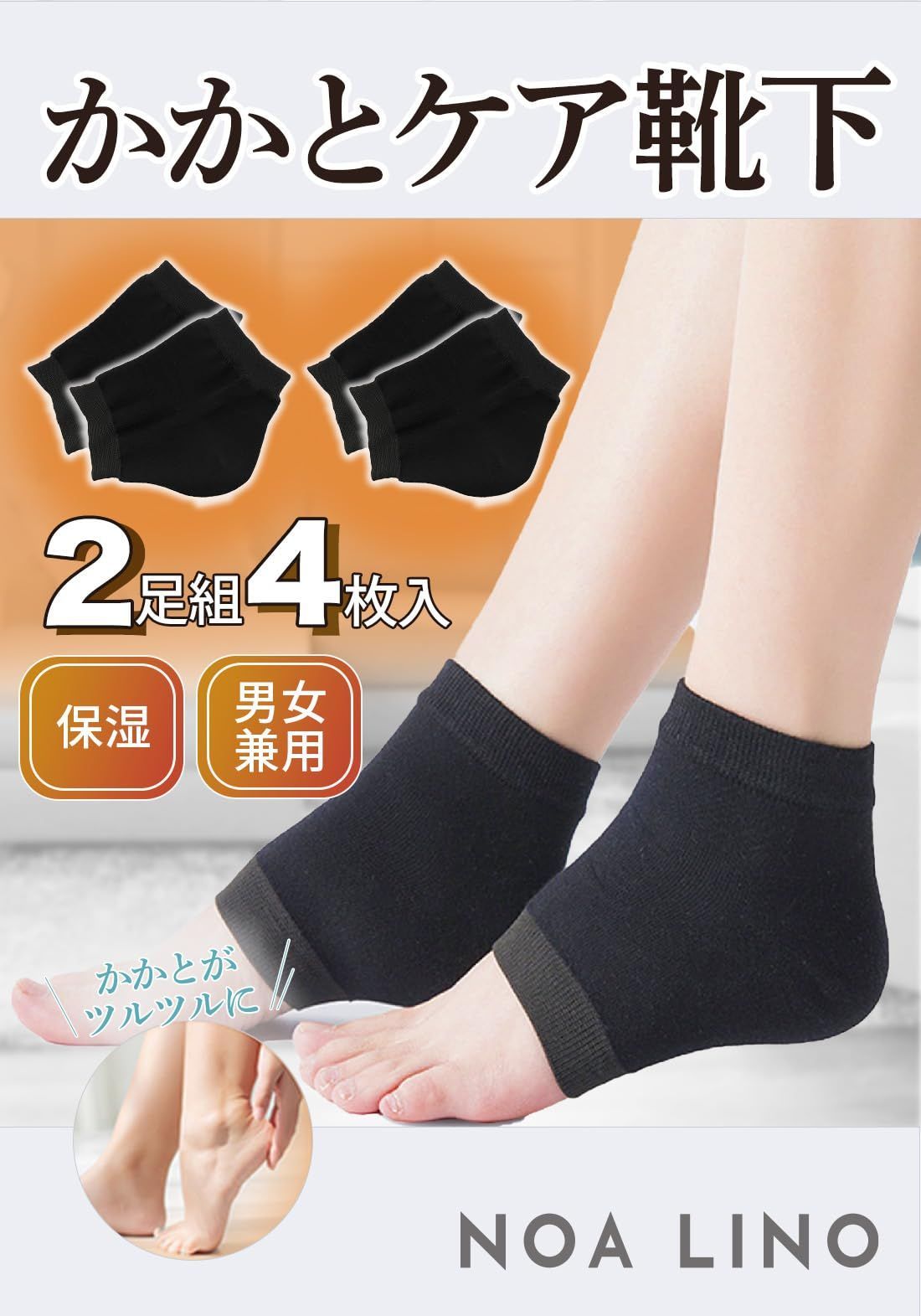 ソックス 履くだけでかかとツルツル 2足組 ひび割れ対策 男女兼用 かかと保湿 フリーサイズ 靴下 NOA LINO かかとケア (ショートタイプ(ブラック×2))