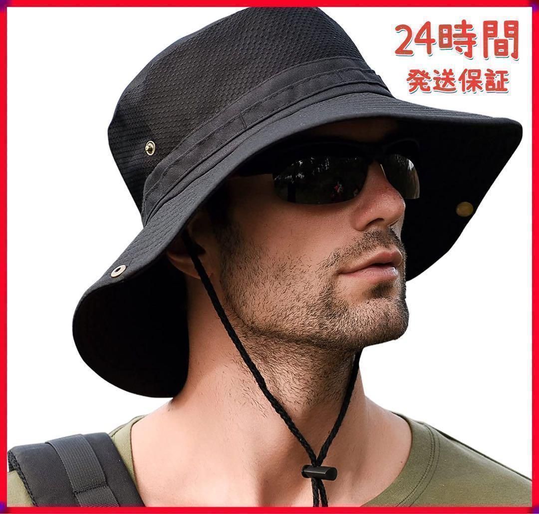 サファリハット UVカット つば広 速乾 軽量 釣り 登山 ハイキング ブラック