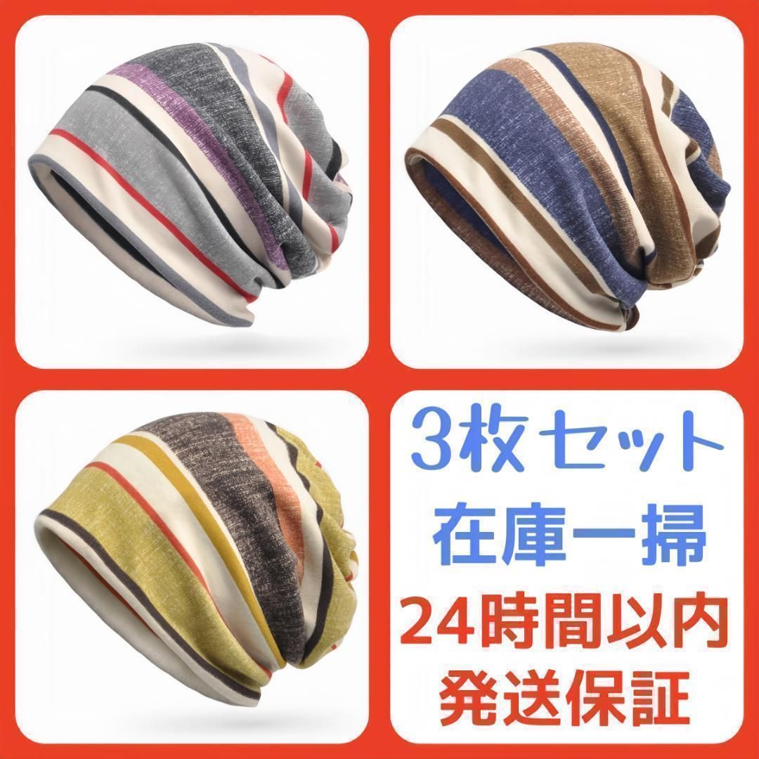 【3枚セット】ニット帽 春 夏 ストライプ 2層構造 医療用帽子 帽子 男女兼用