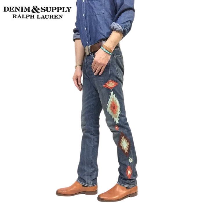 希少 名作 32×32 美品 デニム&サプライ ラルフローレン スリム デニムパンツ チマヨ柄 オルテガ刺繍 サウスウエスタン スリムストレートジーンズ