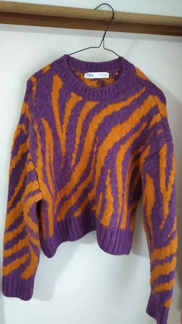 値下げ美品ZARA 紫とオレンジ ジャガード ゼブラ 柄ニットセーター Sサイズ