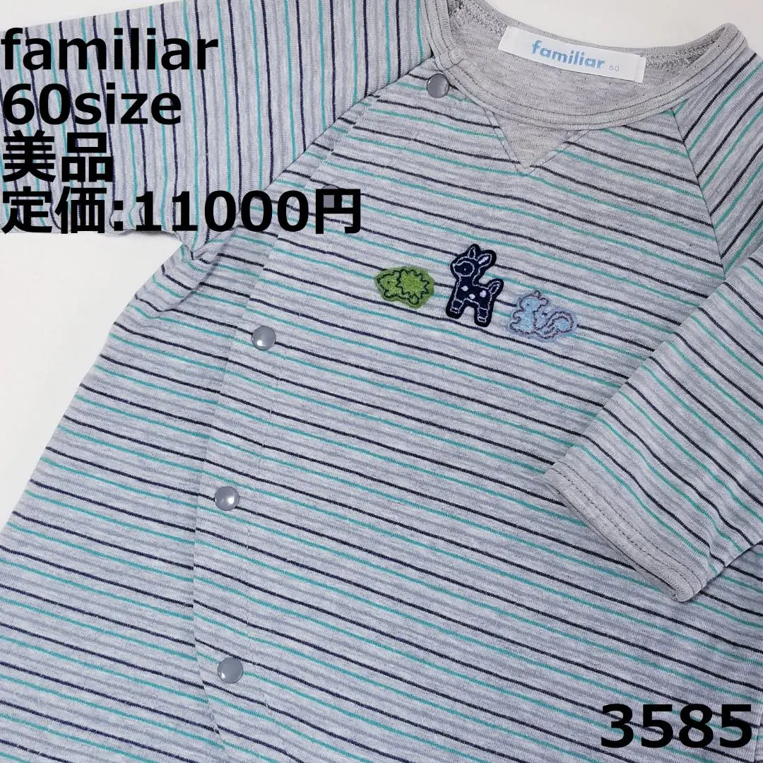 3585 【美品】 ファミリア ロンパース 60 長袖 ボーダー グレイ