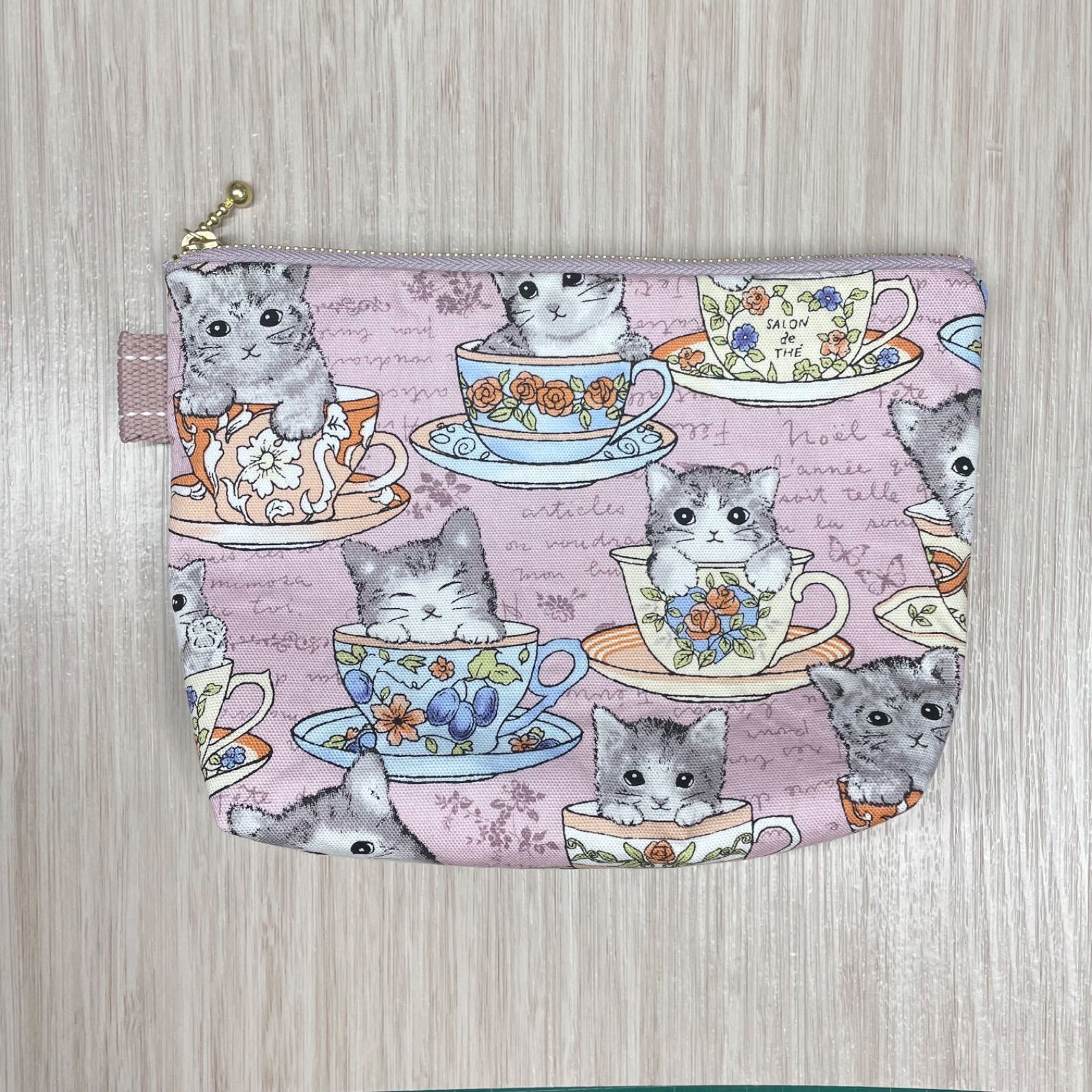 ねこのポーチ 化粧ポーチ 小物入れ ピンク コーヒーカップ猫 ☆ ハンドメイド 大きめ 20センチファスナー