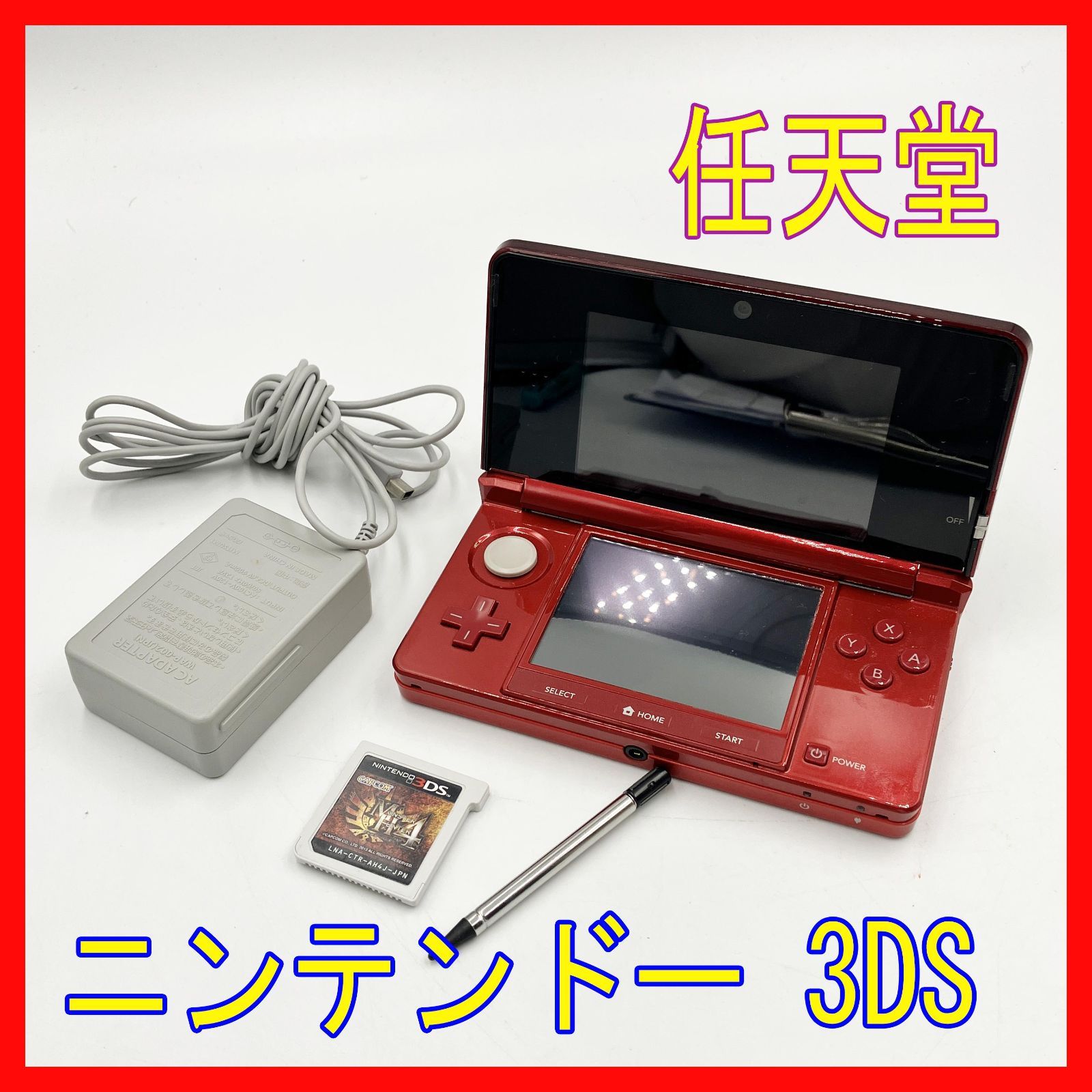 0407-10【動作確認済】ニンテンドー3DS フレアレッド 本体 アダプター タッチペン ソフト付(モンハン4)任天堂 Nintendo 3DS