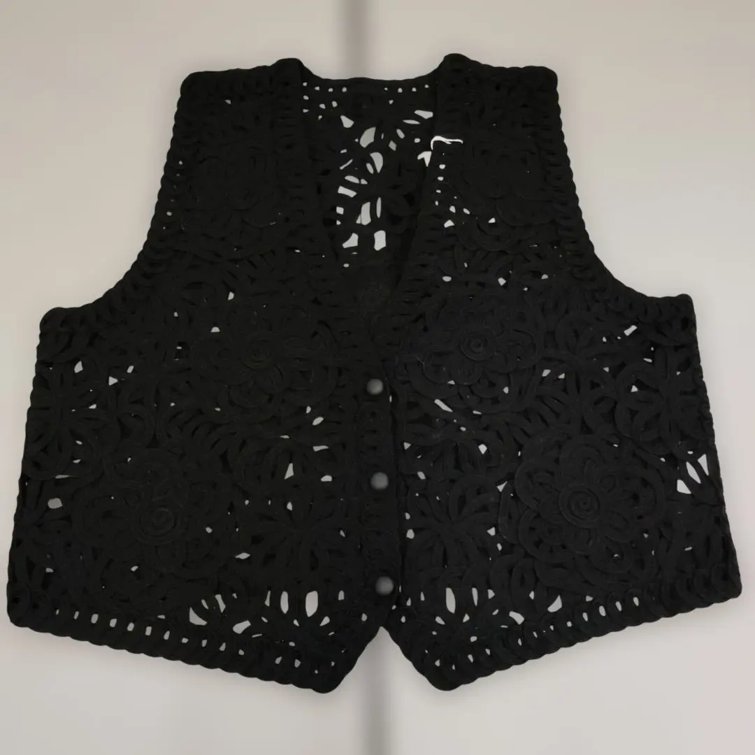 毛100% 花柄 ベスト M〜Lサイズ チョッキ 羽織 黒 ブラック